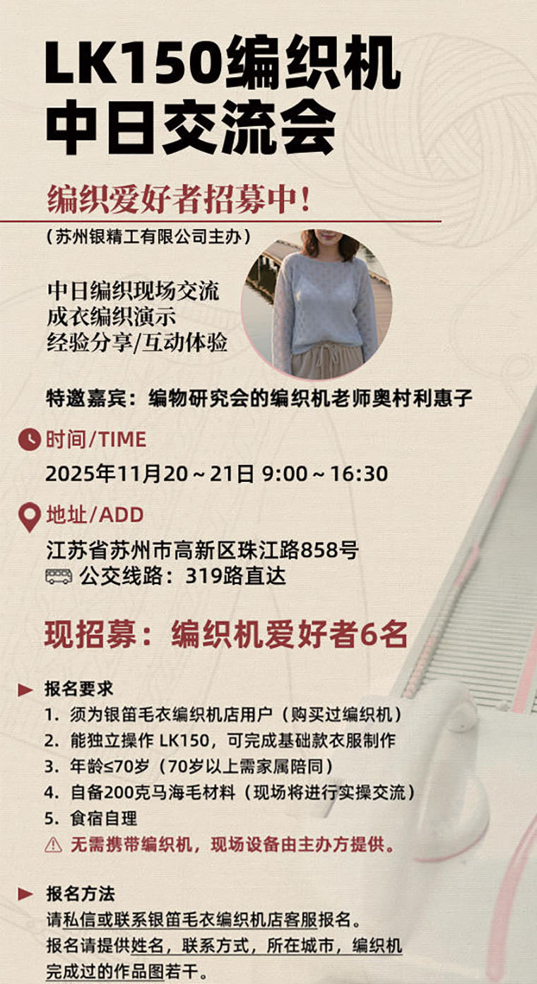 一场中日编织交流会正在积极筹备中,活动得到本社(DLLES IN)的大力支持,特邀日本编物研究会的奥村利惠子老师参加,详见活动海报。